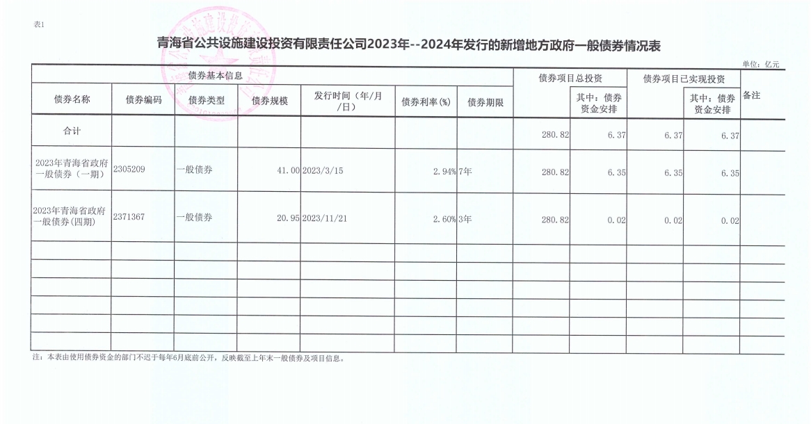 青海省公共設(shè)施建設(shè)投資有限責(zé)任公司2023年--2024年發(fā)行的新增地方政府一般債券情況表
